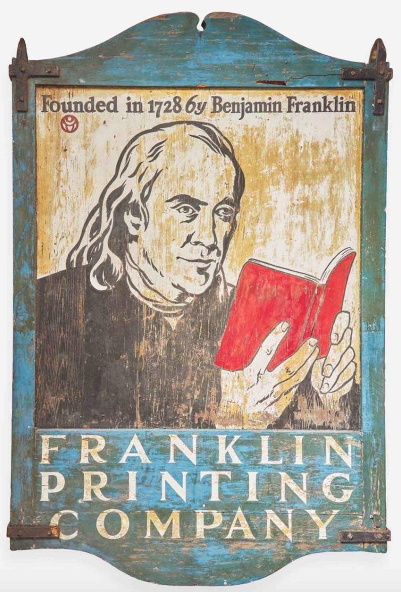 Also featured is a painted wood Franklin Printing Company shop sign, circa 1920, by Edward Penfield (1866-1925) which has an estimate of $800 - $1,200. It is double-sided, mounted with wrought iron hardware, inscribed, “Founded in 1728 by Benjamin Franklin/ Franklin Printing Company," and signed with artist's cipher. This sign was produced for the Franklin Printing Company's shop front at their 514-520 Ludlow Street location which was newly renovated in 1920. The company originated from Benjamin Franklin's original printing operation, and went through several iterations over the following centuries