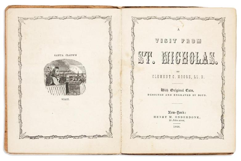 Lot 231: Clement C. Moore, A Visit from St. Nicholas, rare first fully-illustrated book-length edition of ‘Twas the Night Before Christmas, New York, 1848. Estimate $6,000 to $8,000.
