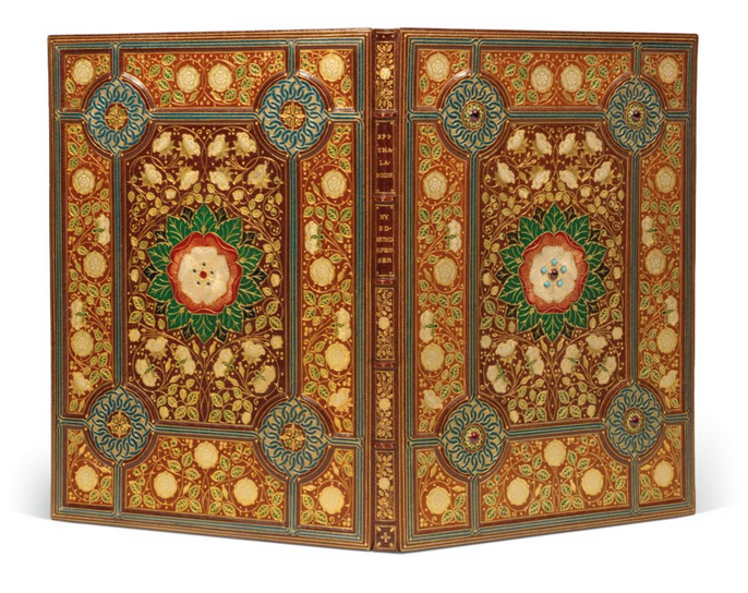 A further highlight of the auction is a beautiful jewelled binding adorned with garnets and turquoise on a manuscript on vellum, written, illuminated and bound by Francis Sangorski and George Sutcliffe (estimate: £10,000–15,000). Inside, comprising 24 stanzas, is Edmund Spenser’s poem recalling every hour of his wedding day to Elizabeth Boyle in 1594. Sangorski and Sutcliffe founded their bindery in 1901 and were the first to ‘create the art of jewelled leather binding’. Their first jewelled binding covered an edition of Spenser’s Epithalamion (now at the British Library) and many of its design elements are found on the present manuscript of the same Spenser poem. Sangorski and Sutcliffe’s greatest masterpiece – the Great Omar, created in 1910 – famously went down with the Titanic.