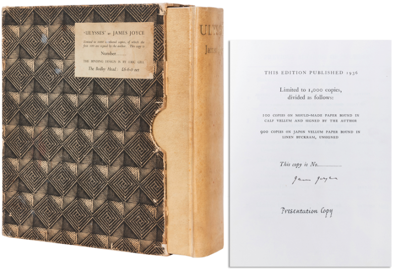 Presentation copy of the 1937 Bodley Head edition of James Joyce's Ulysses, offered at Potter & Potter Auctions this week.