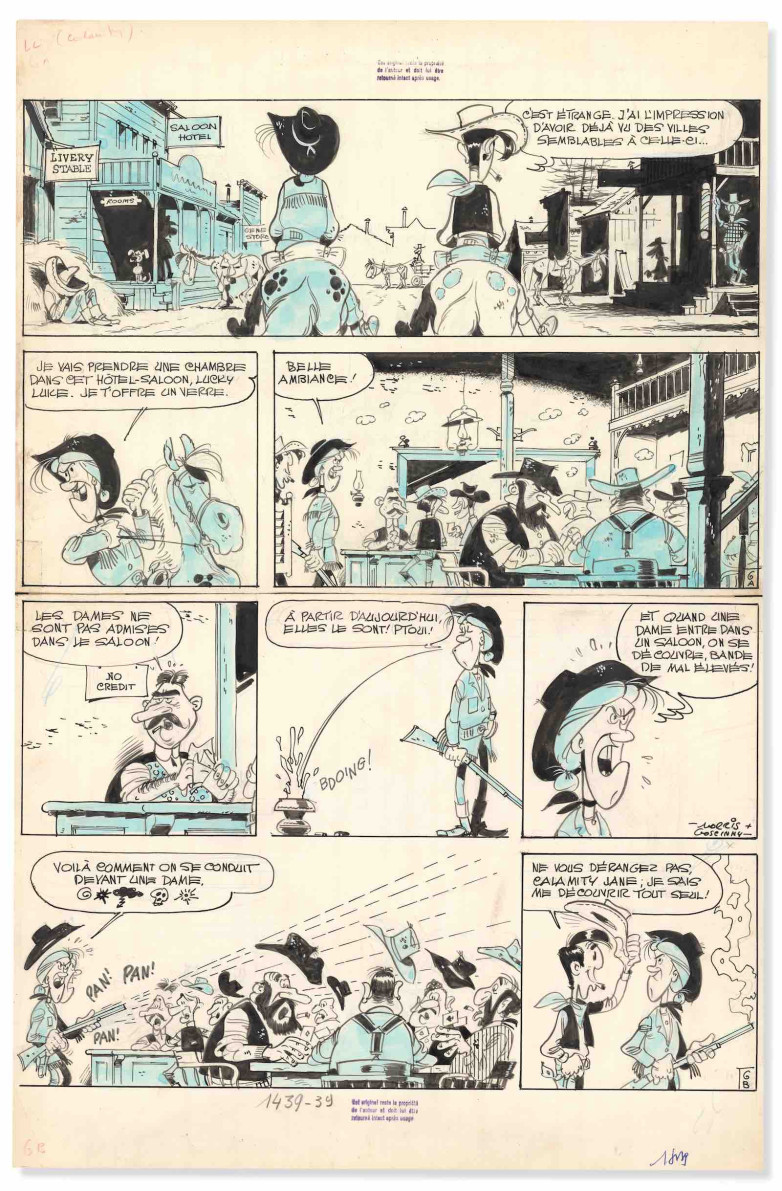 The adventures of Lucky Luke were first published in 1946 under the title Arizona 1880. The first full-length album was published in 1947, followed by 71 others throughout Morris’s lifetime. René Goscinny wrote the script for almost half of his albums. The 50 comic book pages for sale come from dozens of different albums.