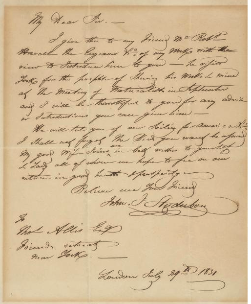 An 1831 John James Audubon letter to Thomas Allis, offered at Doyle on Tuesday.