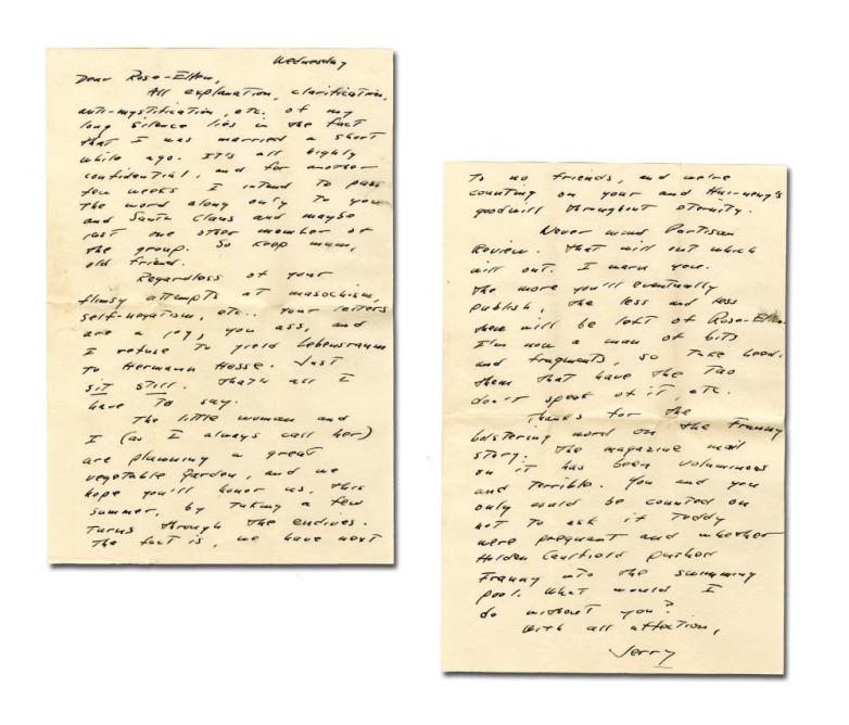 Letter written and signed by author J.D. Salinger dated 1955, to Rose-Ellen Currie, a young writer in New York City, mentioning Holden Caulfield and Franny. Est. $10,000-12,000