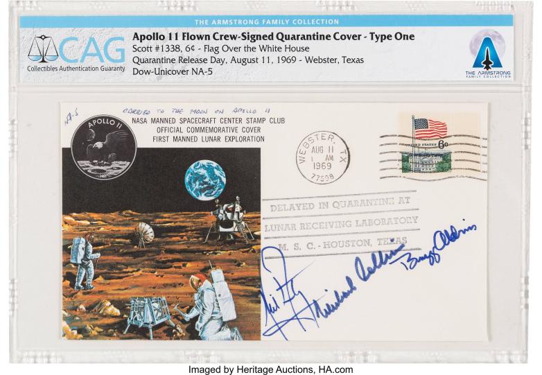 · A single Apollo 11 flown crew-signed and stamped "Type One" Quarantine Cover also sold for $93,750. Signed by Armstrong and crew astronauts Michael Collins and Buzz Aldrin, Armstrong did not receive the piece until three weeks later when the crew completed mandatory quarantine following Apollo 11’s splashdown.