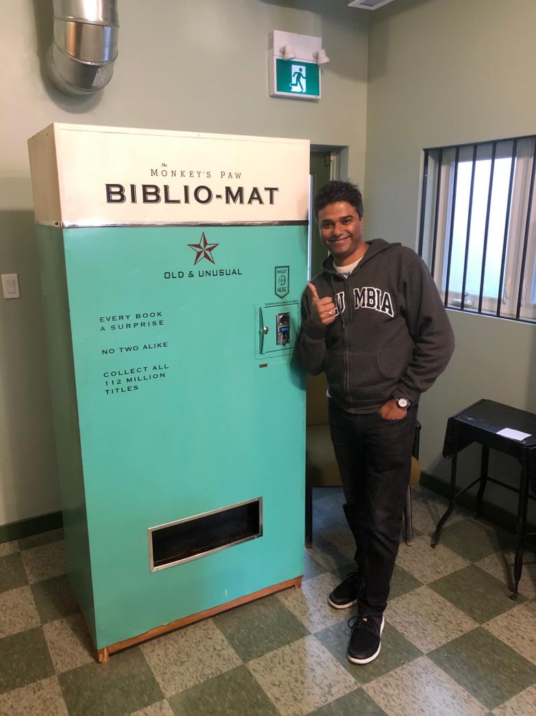 As to why no one has replicated the Biblio-Mat: first of all, I can't say for sure that they haven't... although I've never seen another one anywhere else. But if no one has built another, I suppose the reasons would be as follows: engineering a machine to serve up random books of various dimensions is actually a pretty complicated undertaking; selling hard-to-find books for $3 each is not a lucrative business proposition; and locating sufficient interesting old books to stock the thing is a never-ending challenge. Only a crazy person would ever do it! [Editor’s Note: “New book” vending machines have been around since the 40s.]
