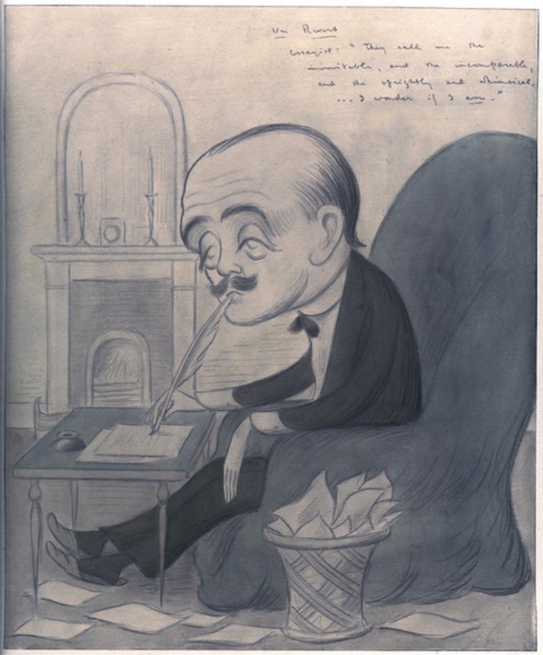 The exhibition maps the career of Sir Max Beerbohm (knighted in 1939) in relation to the idea of celebrity, following him from his early days in the decadent circles of Oscar Wilde and Aubrey Beardsley through his late career as a radio performer on BBC broadcasts during World War II. Along the way, he knew, drew, and wrote about many other celebrities, from Henry James to Virginia Woolf and George Bernard Shaw to members of the Royal Family.